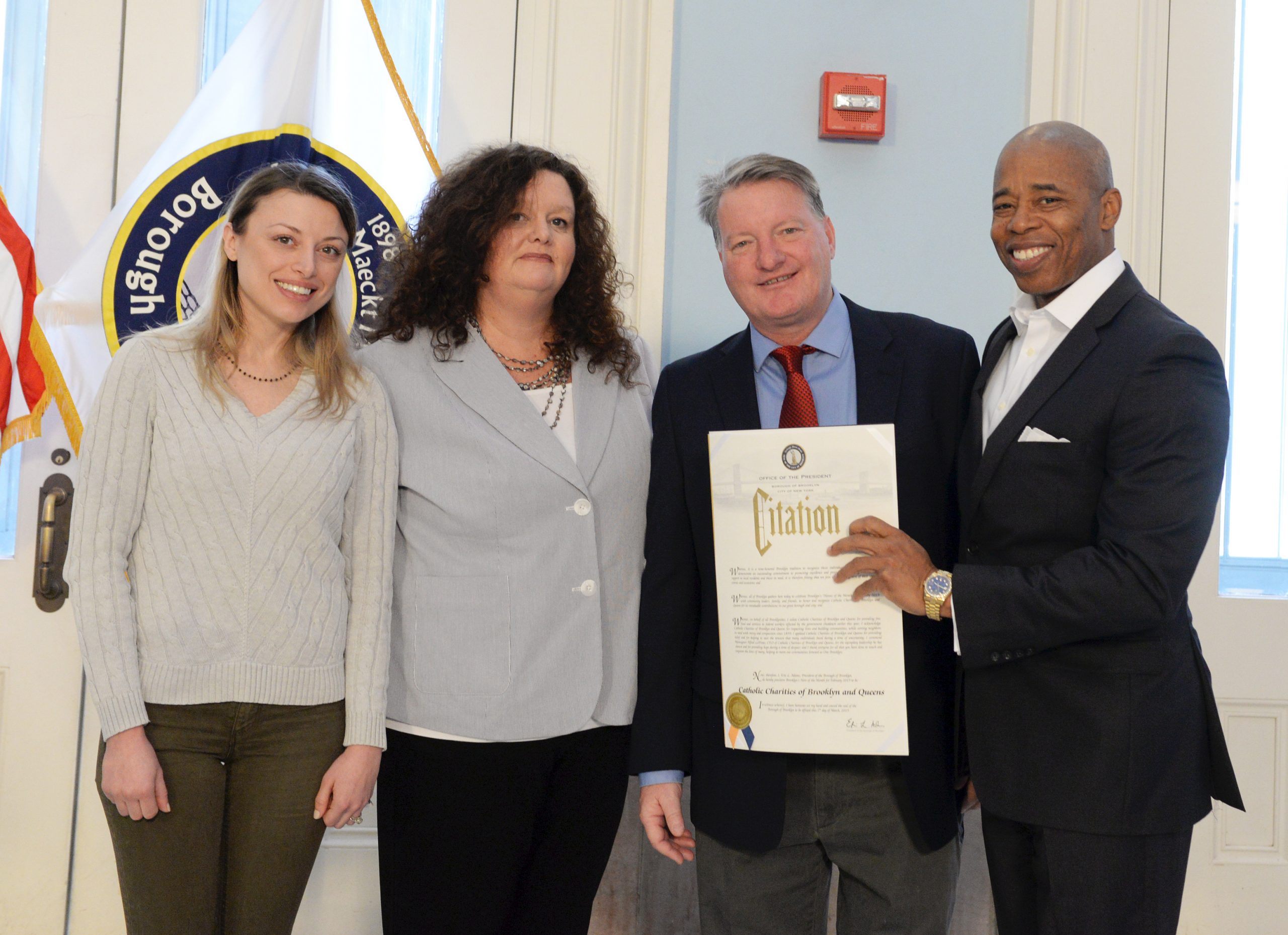 On Thursday, March 7th Catholic Charities Brooklyn and Queens was one of four organizations honored as the latest “Heroes of the Month” by Brooklyn Borough President Eric Adams. The ceremony held in the Rotunda of Brooklyn Borough Hall recognized Catholic Charities for providing free services to federal workers during the government shutdown earlier this year. Accepting the Citation on behalf of Catholic Charities Brooklyn and Queens were Richard Slizeski, Vice President for Mission, Jennifer Smith, Food Pantry Supervisor and Joanna Shkreli, Event Facilitator.