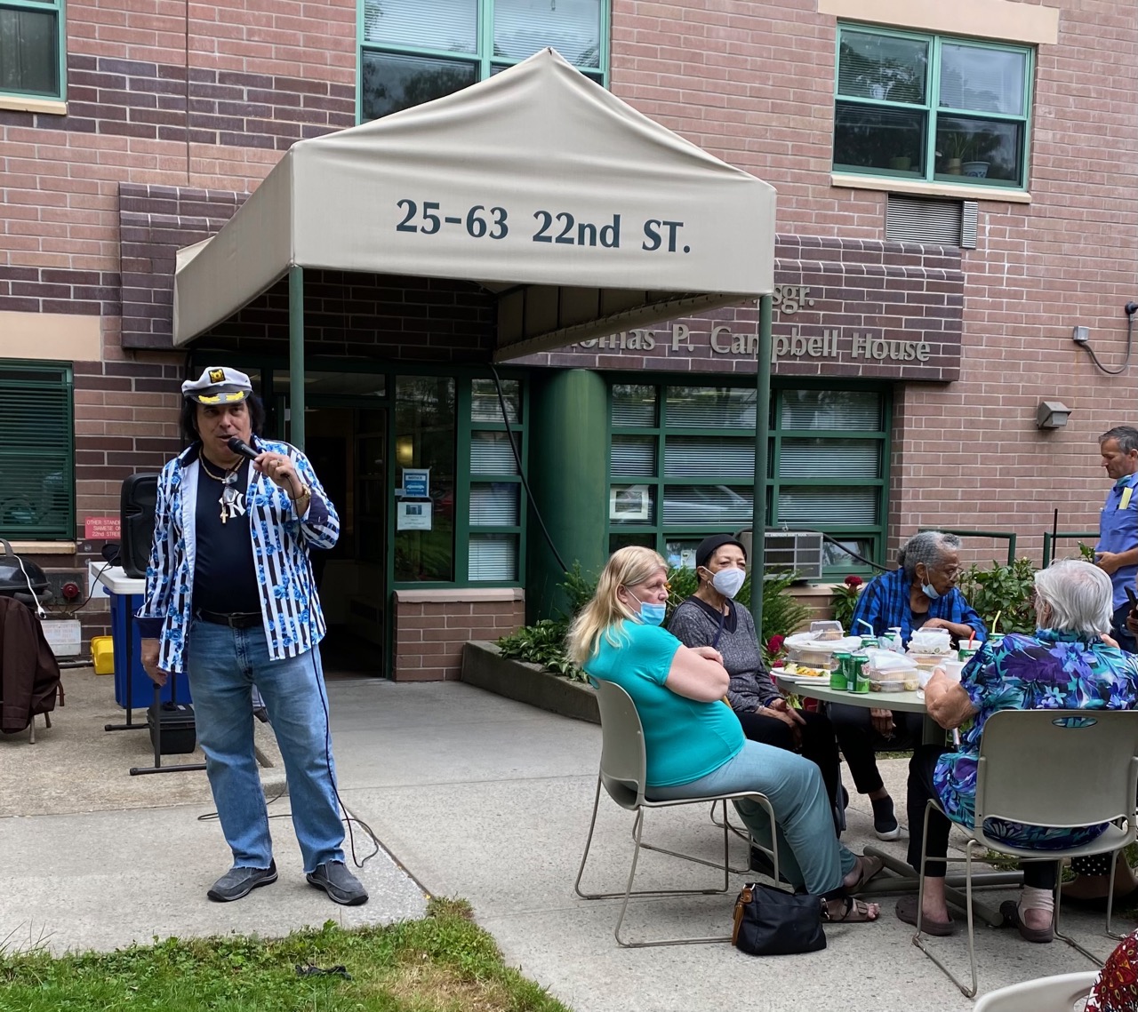 Residents of the Catholic Charities Msgr. Thomas Campbell Senior Apartments in Astoria, Queens recently enjoyed an afternoon of fun in the sun with an outdoor BBQ complete with delicious food and great music. Residents enjoyed yummy chicken, hot dogs, hamburgers, japchae, gimbap, assorted salads, rice and beans, fresh fruit and more. One of our very talented residents entertained the group with Elvis cover songs and more. Catholic Charities Brooklyn and Queens Community Outreach Services was also on hand, helping where needed to make the day very special for all!