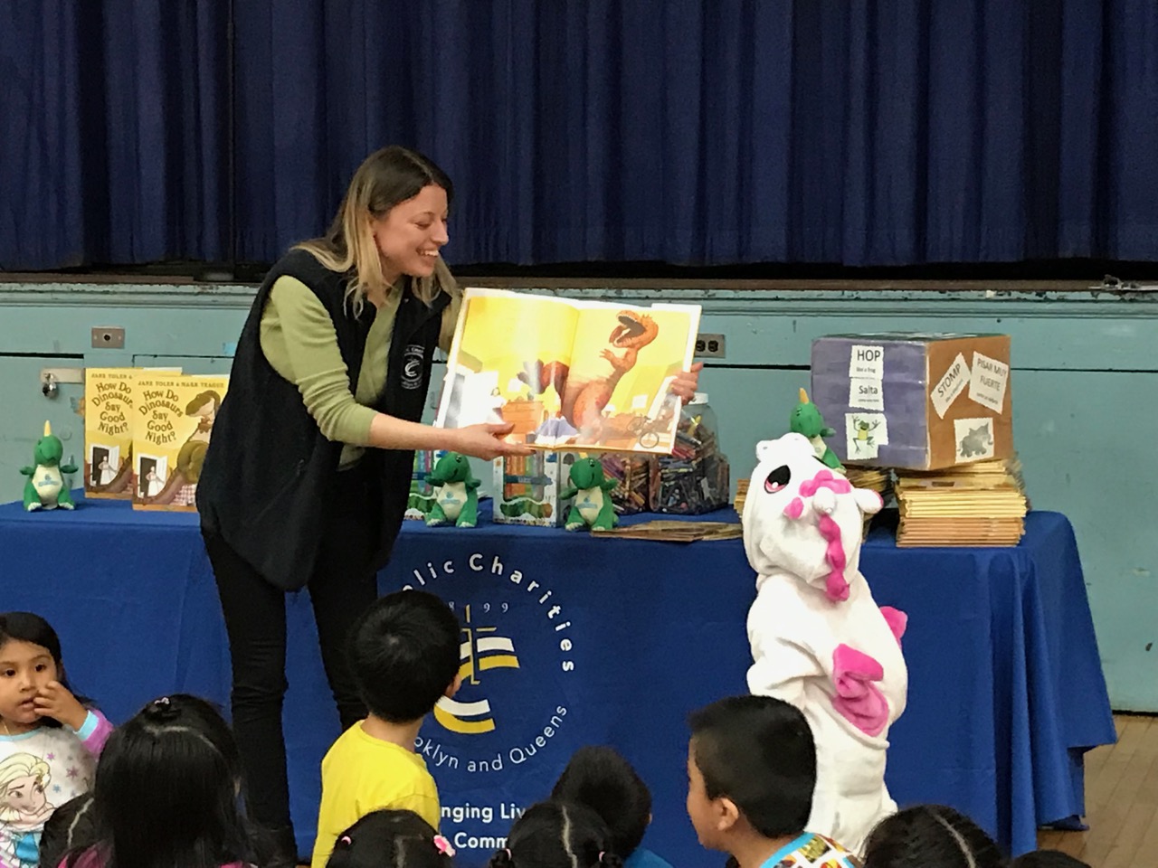 CCBQ’s Community Program Services recently held Pajama Storytime at the Catholic Charities Sunset Park Early Childhood Development Center in Sunset Park, Brooklyn. Over 100 attendees were dressed in comfy pajamas excited to read How Do Dinosaurs Say Goodnight? by Jane Yolen and Mark Teague. Families also enjoyed a special guest appearance by Fidelisaurus, a friendly dinosaur who encouraged physical activity through games. Families went home with raffled $25 Target gift cards, children’s author Eric Carle book sets and a copy of How Do Dinosaurs Say Goodnight?