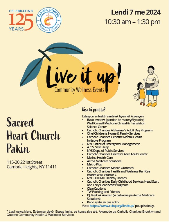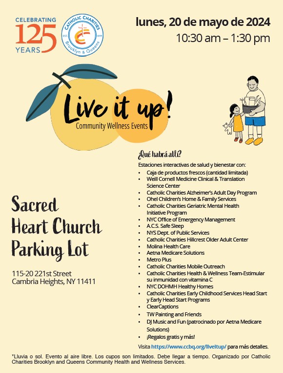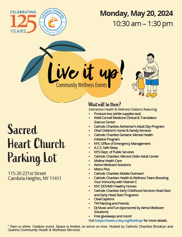 WHAT: Catholic Charities Brooklyn and Queens Community Health and Wellness Services will host a Live it up! Community Wellness event in Queens featuring interactive health and wellness stations.